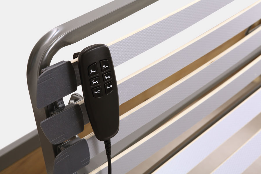 • 5 planos articulados por motor doble con mando por cable, siendo fijo el plano lumbar, que a su vez incorpora doble lama y cursores para la regulación de firmeza.