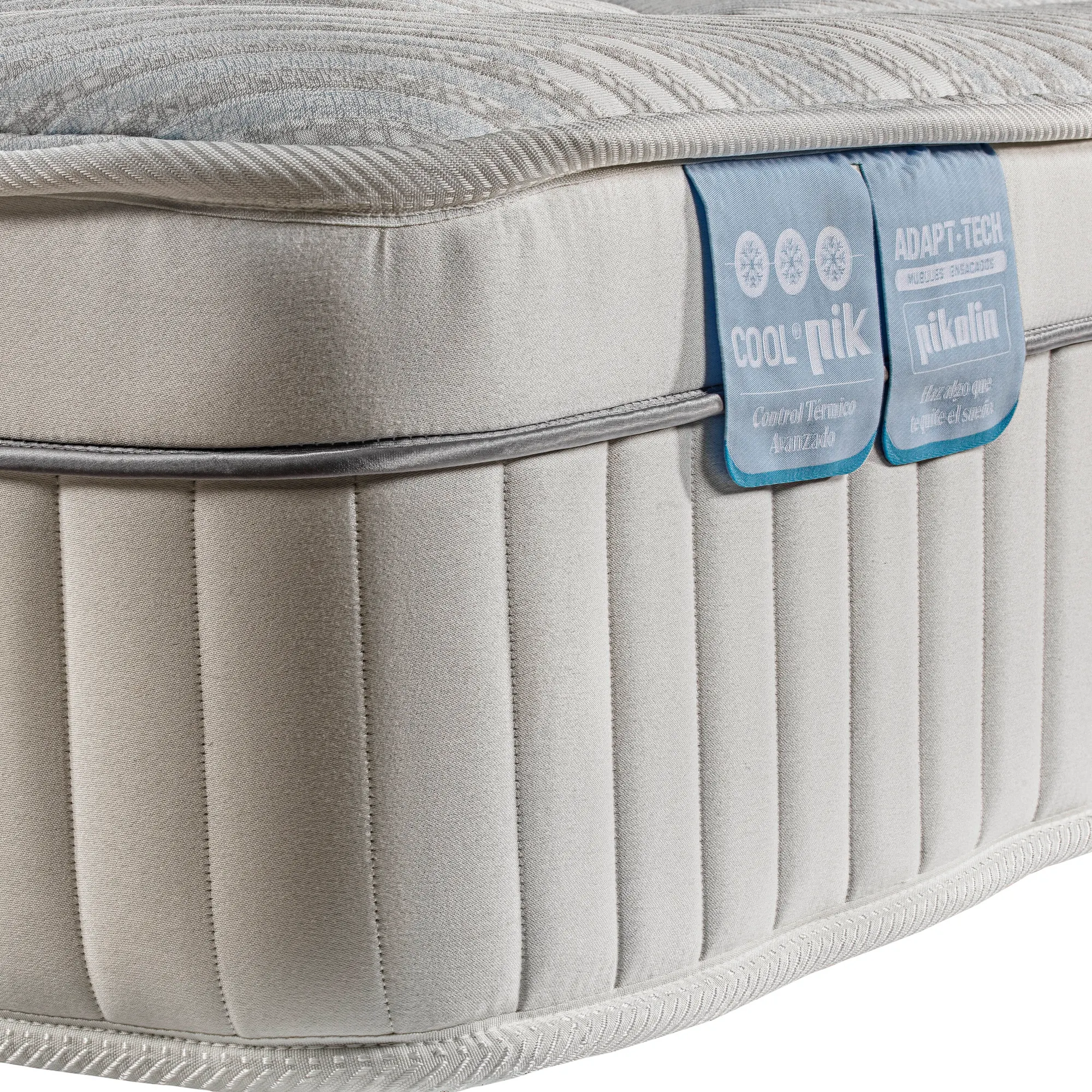 El colchón Coolpik es la elección perfecta si buscas un descanso fresco y ergonómico, con una altura de 30 cm y una firmeza media muy equilibrada. Su núcleo de muelles ensacados Adapt-Tech está formado por muelles independientes que se ajustan punto por punto a tu morfología, asegurando una postura correcta y la independencia de lechos para que no notes los movimientos de tu pareja. La gran innovación de este modelo reside en su tejido exterior con hilo frío de alta densidad, diseñado específicamente para disipar el calor corporal y ofrecerte una sensación de frescor instantáneo al tacto. Esta frescura se complementa con el acolchado de alta gama Progression Fiber, una combinación técnica de dos capas: una de espuma supersuave para una acogida dulce y envolvente, y una capa de fibra de poliéster termorreguladora que facilita la circulación del aire por el interior. Por último, tu descanso estará protegido gracias a la tecnología Triple Barrera, un tratamiento de higiene total que bloquea permanentemente la aparición de ácaros, bacterias y hongos.